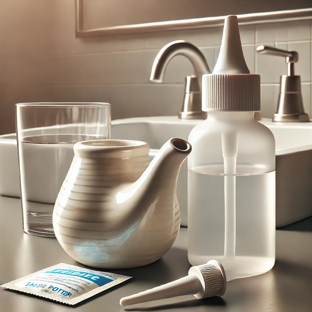 준비물: 약국에서 구매한 코 세척용기, 체온과 비슷한 온도의 생리식염수(또는 코 세척용 분말)